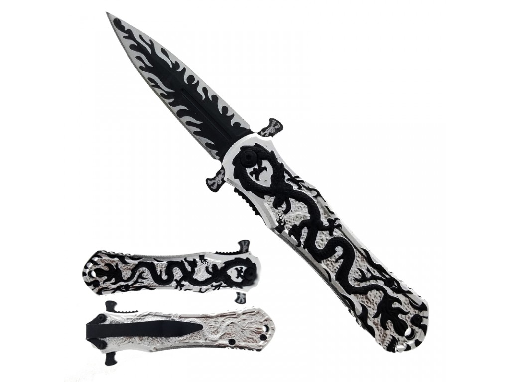 8" Overall Length Assisted Knife w/blk dragon on sliver alum handl
