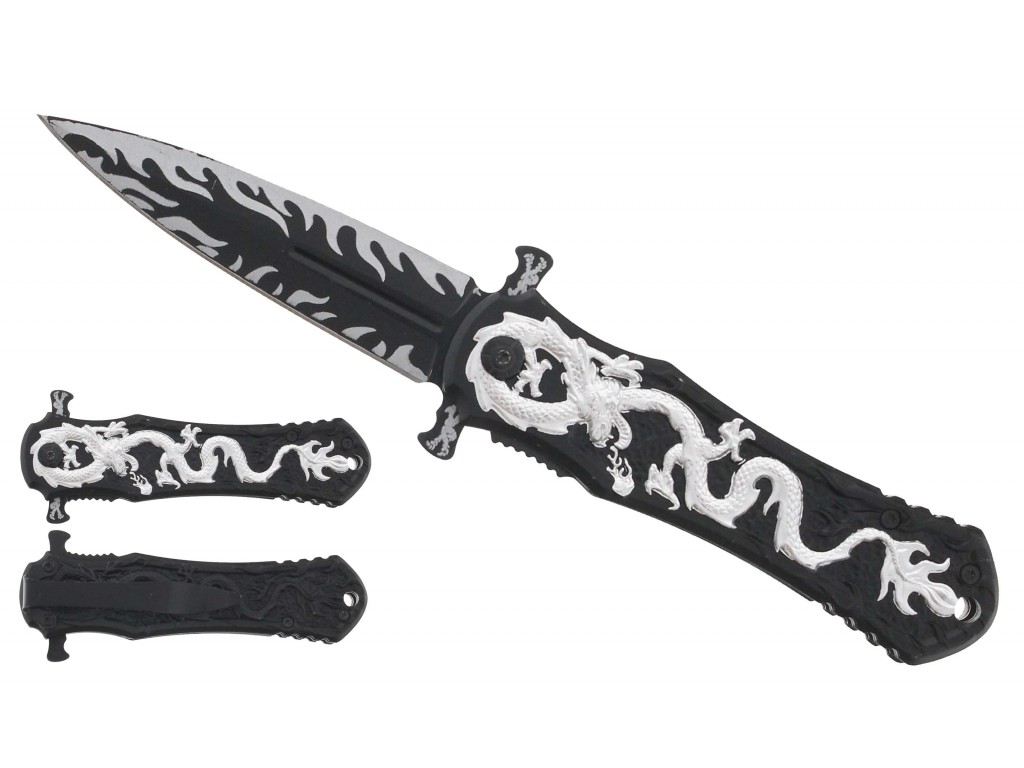 8" Overall Length Assisted Knife w/blk dragon on sliver alum handl